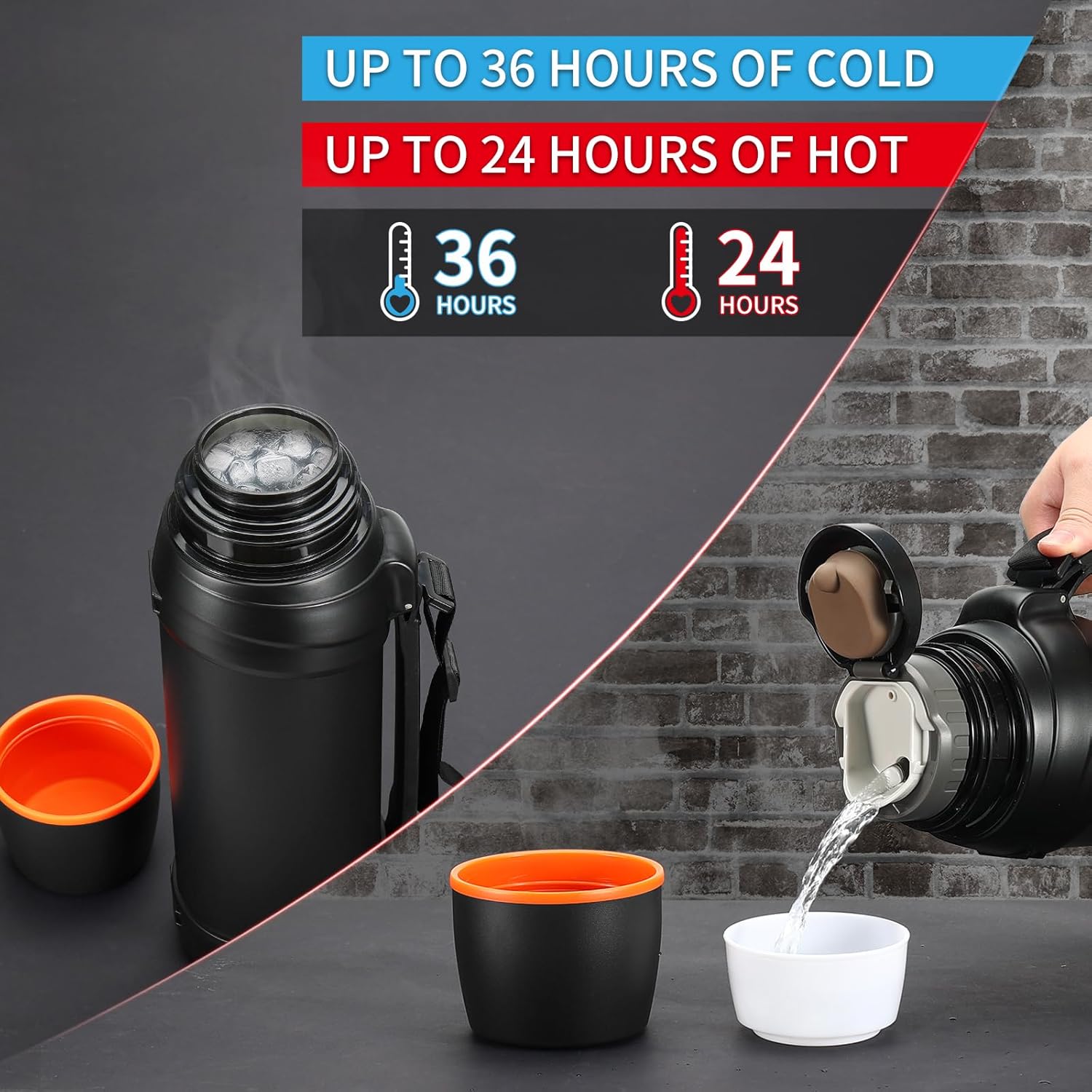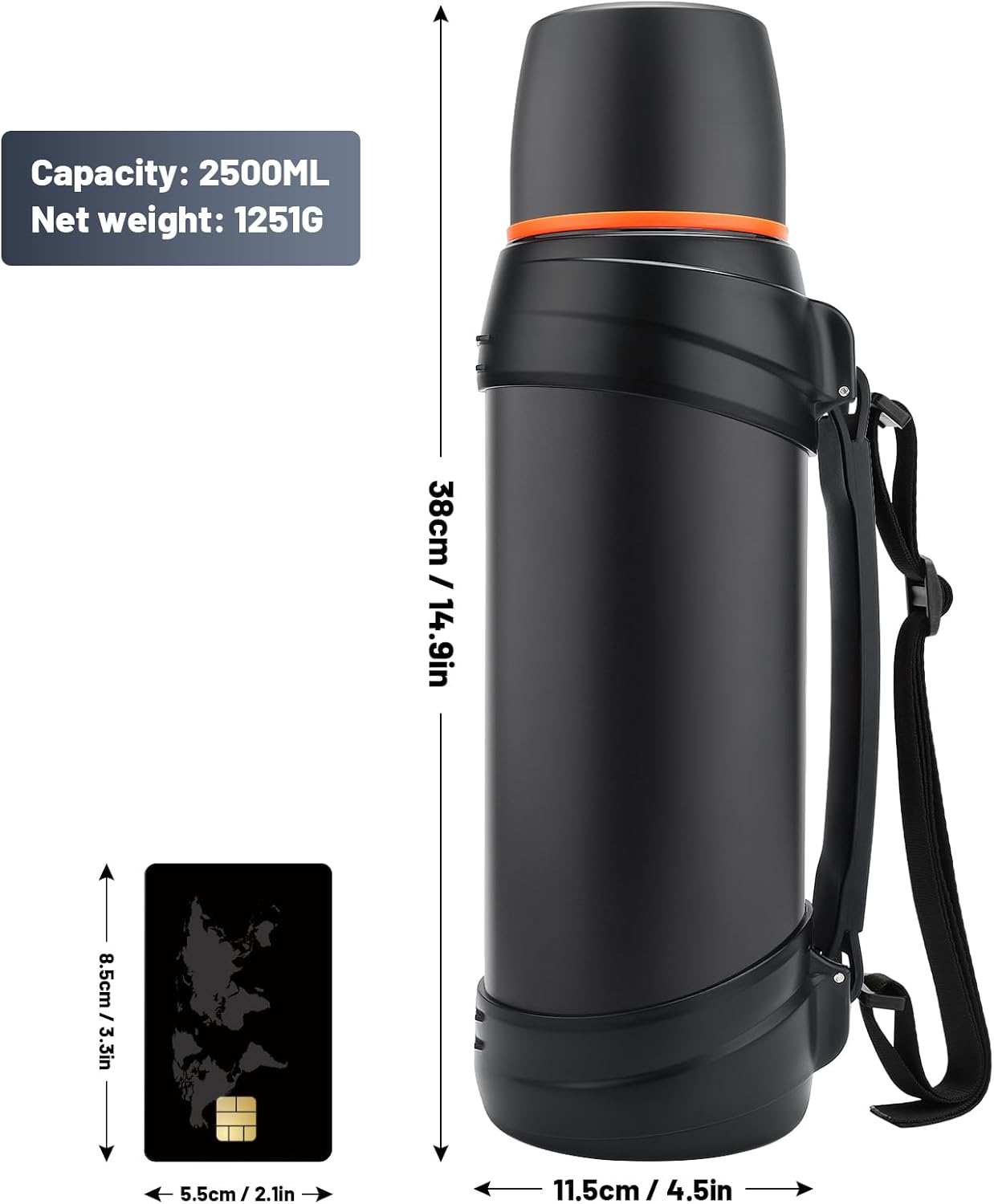 Diese hochwertige Thermo-Trinkflasche aus rostfreiem Edelstahl mit 2,5 L Fassungsvermögen ist der ideale Begleiter für unterwegs – egal ob beim Camping, Wandern oder im Büro. Dank der doppelwandigen Isolierung bleiben Ihre Getränke bis zu 24 Stunden heiß oder kalt.